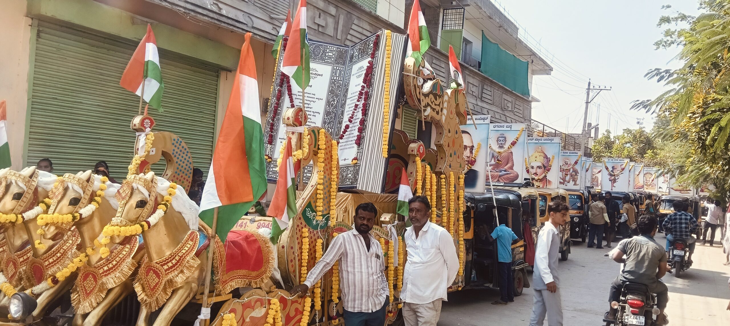 ಚಿತ್ತಾಪುರ: ಪಟ್ಟಣದಲ್ಲಿ ಸೋಮವಾರ ನಡೆಯಲಿರುವ ಸಂವಿಧಾನ ಸಮರ್ಪಣೆ ದಿನದ ಅಂಗವಾಗಿ ಭೀಮ ನಡಿಗೆ ಪಥಸಂಚಲನ ಹಾಗೂ ಸಂವಿಧಾನ ಸಮಾವೇಶ ಕಾರ್ಯಕ್ರಮದ ನಿಮಿತ್ತ ಪಟ್ಟಣದ ಚಿತ್ತಾವಲಿ ವೃತ್ತದಿಂದ ಪ್ರಾರಂಭವಾಗುವ ಮೆರವಣಿಗೆಯಲ್ಲಿ ಸಂವಿಧಾನ ಪೀಠಿಕೆಯೊಂದಿಗೆ ಒಟ್ಟು 22 ಸಮಾಜಗಳ ಗುರುಗಳ ಭಾವಚಿತ್ರಗಳು ನೋಡುಗರ ಕಣ್ಮನ ಸೆಳೆದಿದೆ.