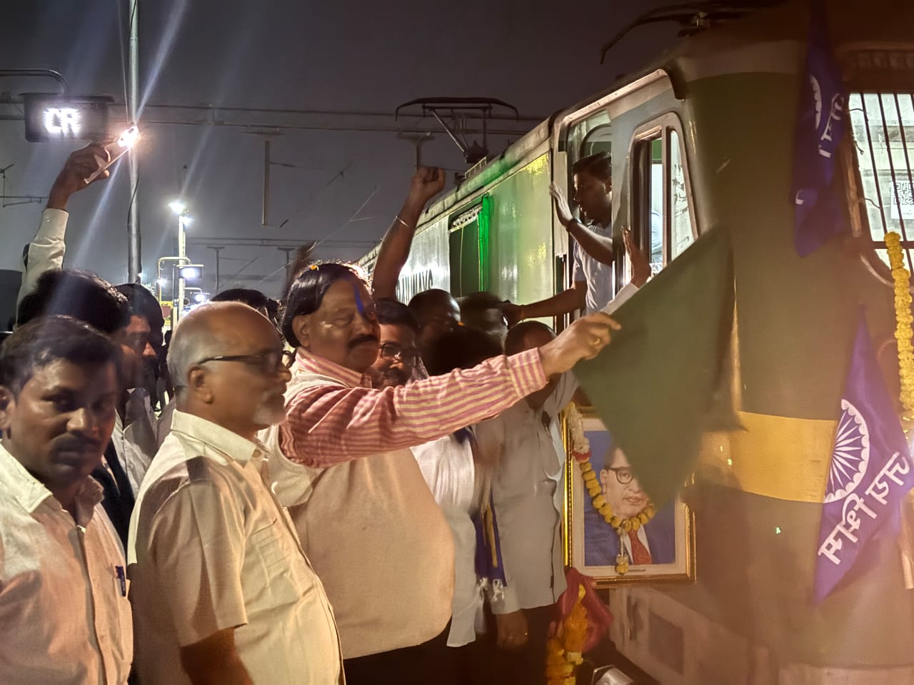 ಕಲಬುರಗಿ: ಡಾ: ಬಾಬಾ ಸಾಹೇಬರ 69ನೇ ಮಹಾಪರಿನಿರ್ವಾಣ ದಿನದ ನಿಮಿತ್ತ ಕಲಬುರಗಿ ಯಿಂದ ಮುಂಬೈಯ ವಿಶೇಷ ರೇಲ್ವೆಗೆ ಸೋಲಾಪುರ ವಿಭಾಗದ ಎಸ್ಸಿ ಎಸ್ಟಿ ಅಧ್ಯಕ್ಷ ಸಚಿನ್ ಬಾನ್ಸೋಡೆ ಹಾಗೂ ಡಿಎಸ್ಎಸ್ ರಾಜ್ಯ ಸಂಚಾಲಕ ಡಾ.ಡಿ.ಜಿ ಸಾಗರ್ ಅವರು ಹಸಿರು ನಿಶಾನೆ ತೋರಿಸುವ ಮೂಲಕ ಶುಕ್ರವಾರ ಚಾಲನೆ ನೀಡಿದರು.
