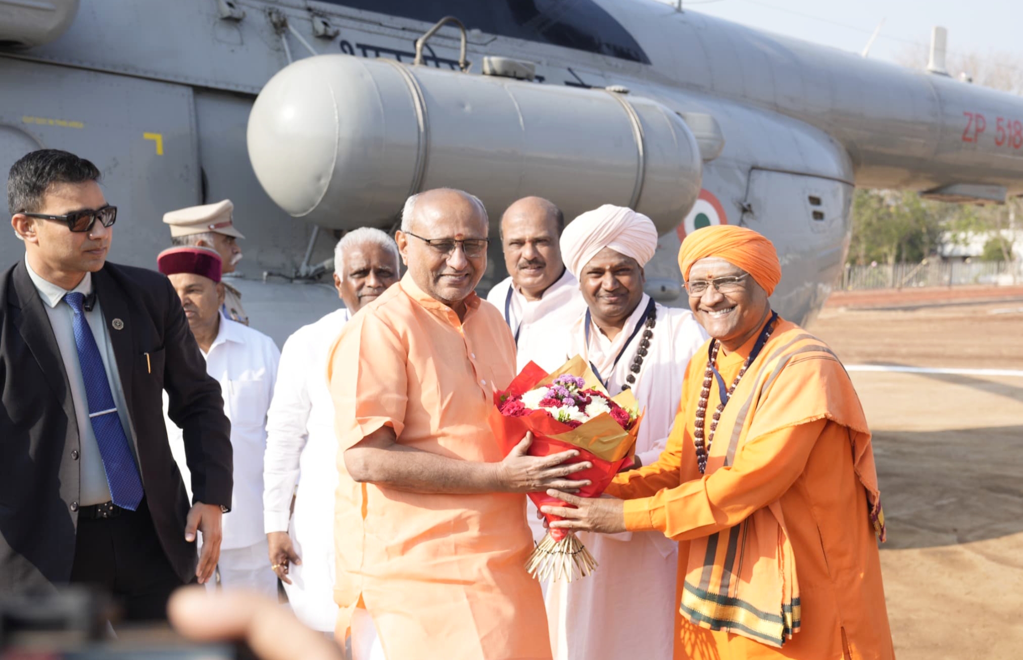 ಬೆಳಗಾವಿ: ಜಿಲ್ಲೆಯ ಚಿಕ್ಕೋಡಿಯ ಯಡೂರದಲ್ಲಿ ಧಾರ್ಮಿಕ ಕಾರ್ಯಕ್ರಮದಲ್ಲಿ ಪಾಲ್ಗೊಳ್ಳಲು ಗುರುವಾರ ಆಗಮಿಸಿದ್ದ ಉಪ ರಾಷ್ಟ್ರಪತಿ ಸಿ. ಪಿ. ರಾಧಾಕೃಷ್ಣನ್ ಹಾಗೂ ರಾಜ್ಯಪಾಲ ಥಾವರಚಂದ್ ಗೆಹ್ಲೋಟ್ ಅವರನ್ನು ಮಲ್ಲಿಕಾರ್ಜುನ ಕೋರೆ, ಸೂಗೂರ ಶ್ರೀ ಡಾ. ಚನ್ನರುದ್ರಮುನಿ ಶಿವಾಚಾರ್ಯರು ಮತ್ತು ಬನಹಟ್ಟಿಯ ಶ್ರೀಗಳು ಹೂ ಗುಚ್ಛ ನೀಡಿ ಸ್ವಾಗತಿಸಿದರು.